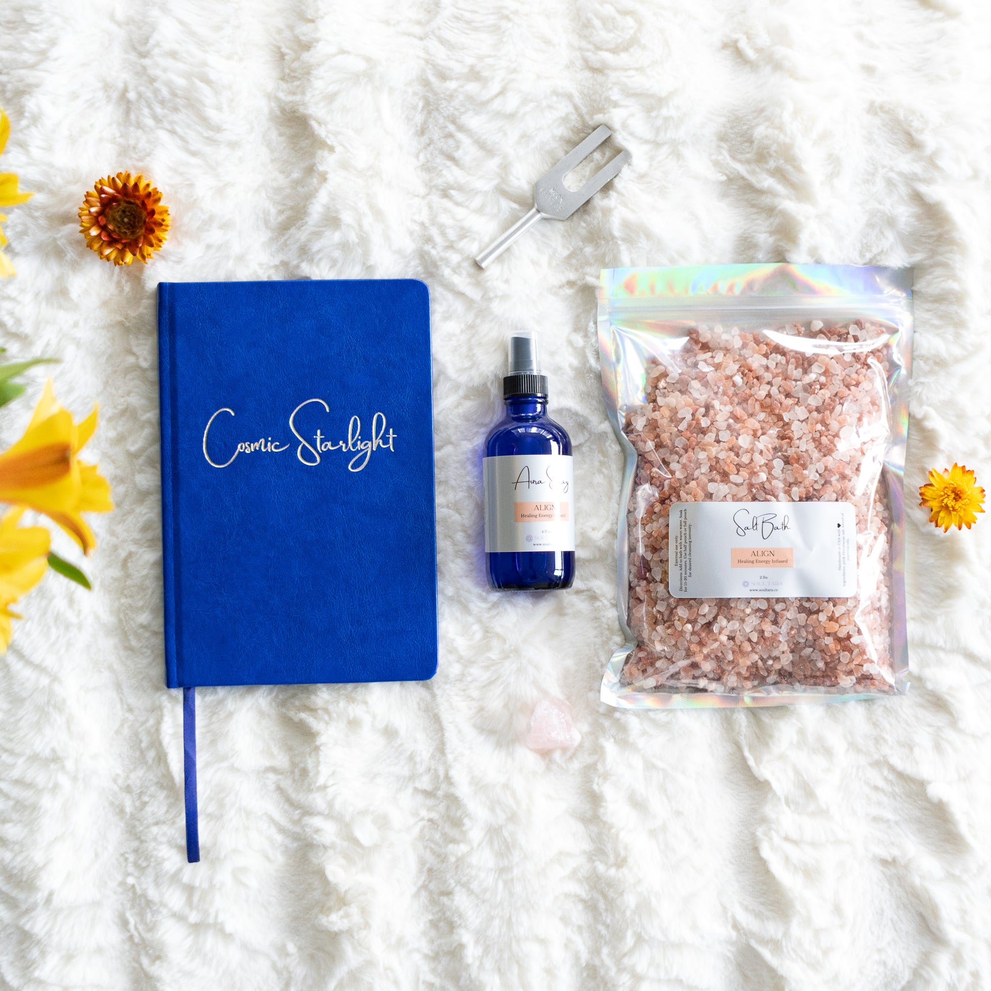 Elevate your wellness ritual with this set, combining the power of journaling with tools to reset your energy and help you feel more clarity and centered. Each gift set includes Cosmic Starlight journal, Align Aura Spray, and Align Bath Salt.