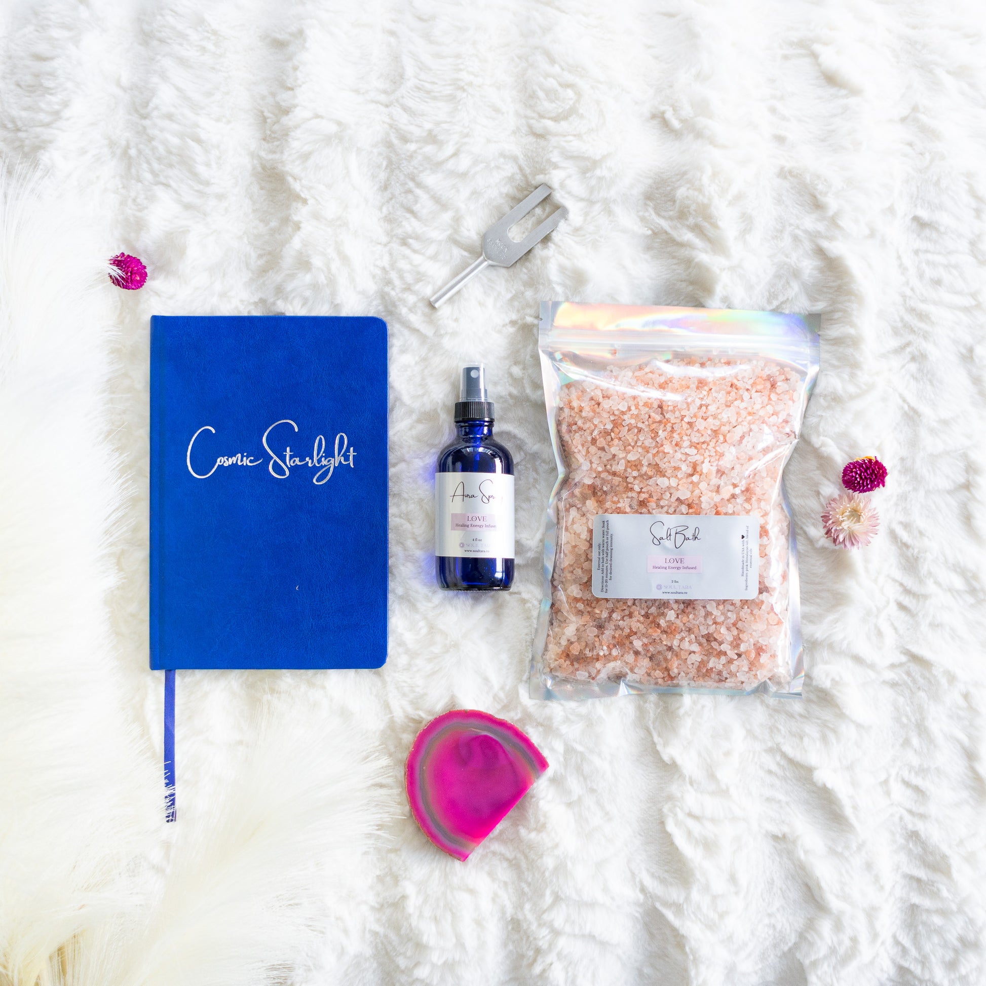 Elevate your wellness ritual with this set, combining the power of journaling with tools to reset your energy and tap into the energy of love. Each gift set includes Cosmic Starlight journal, Love Aura Spray, and Love Bath Salt.